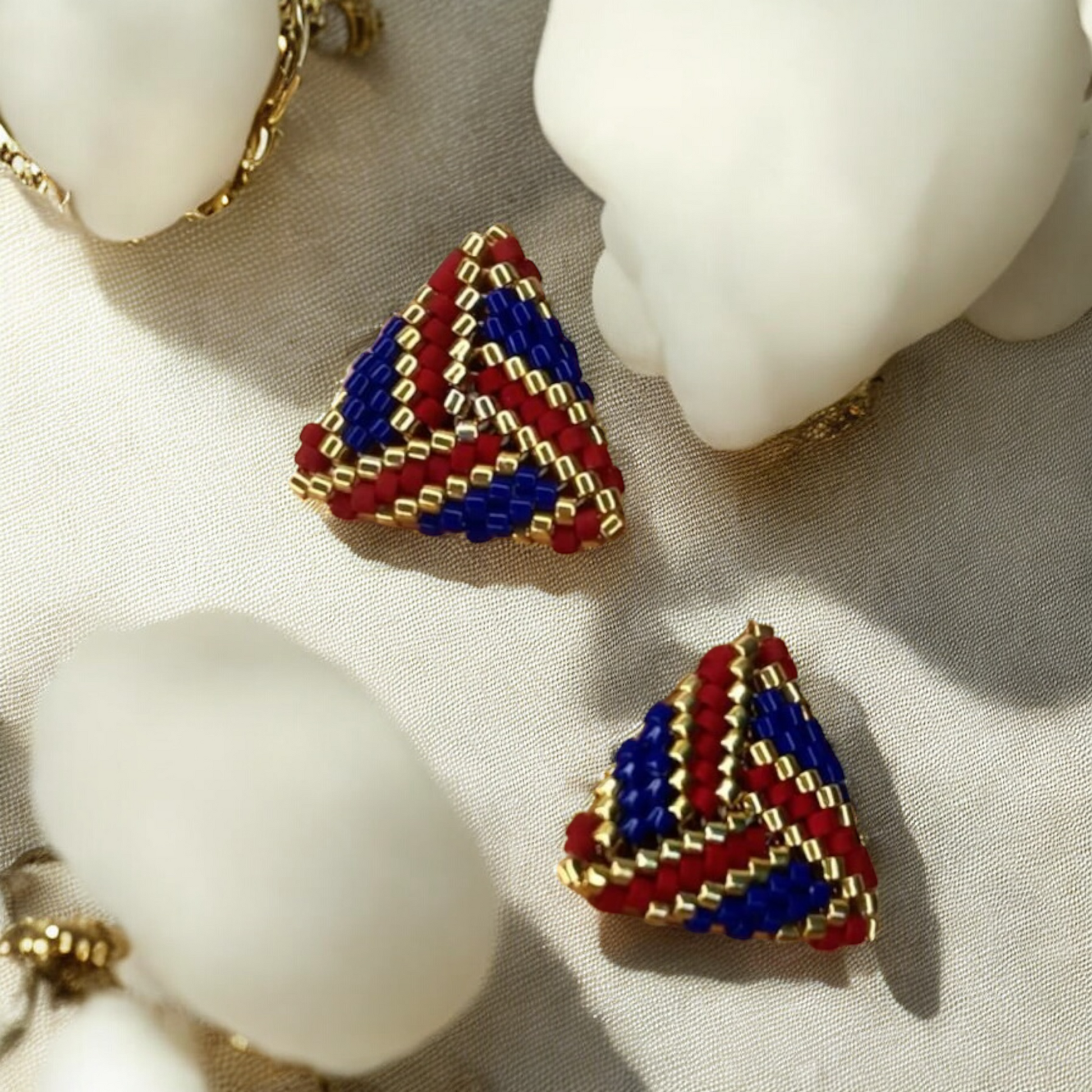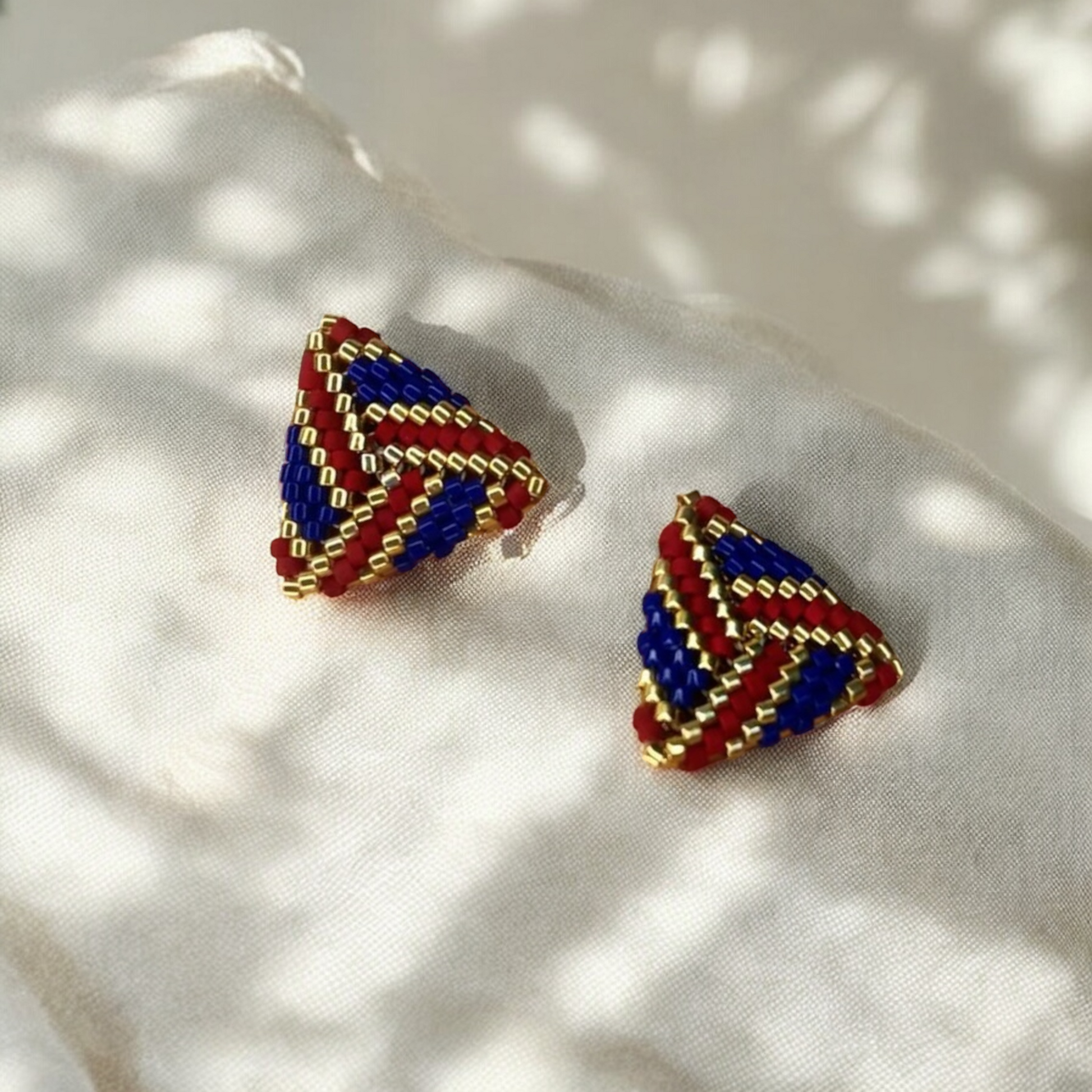 A Astra kézzel fűzött, háromszög alakú fülbevaló, piros–kék–arany színekben.