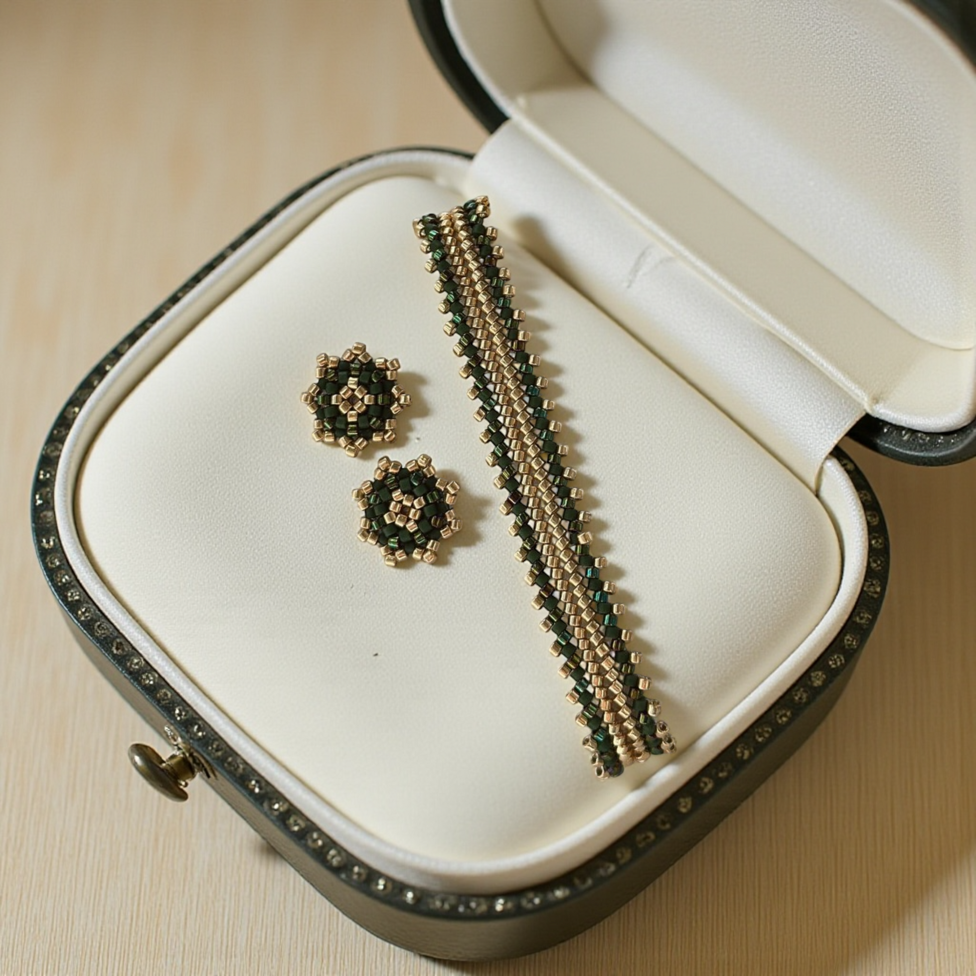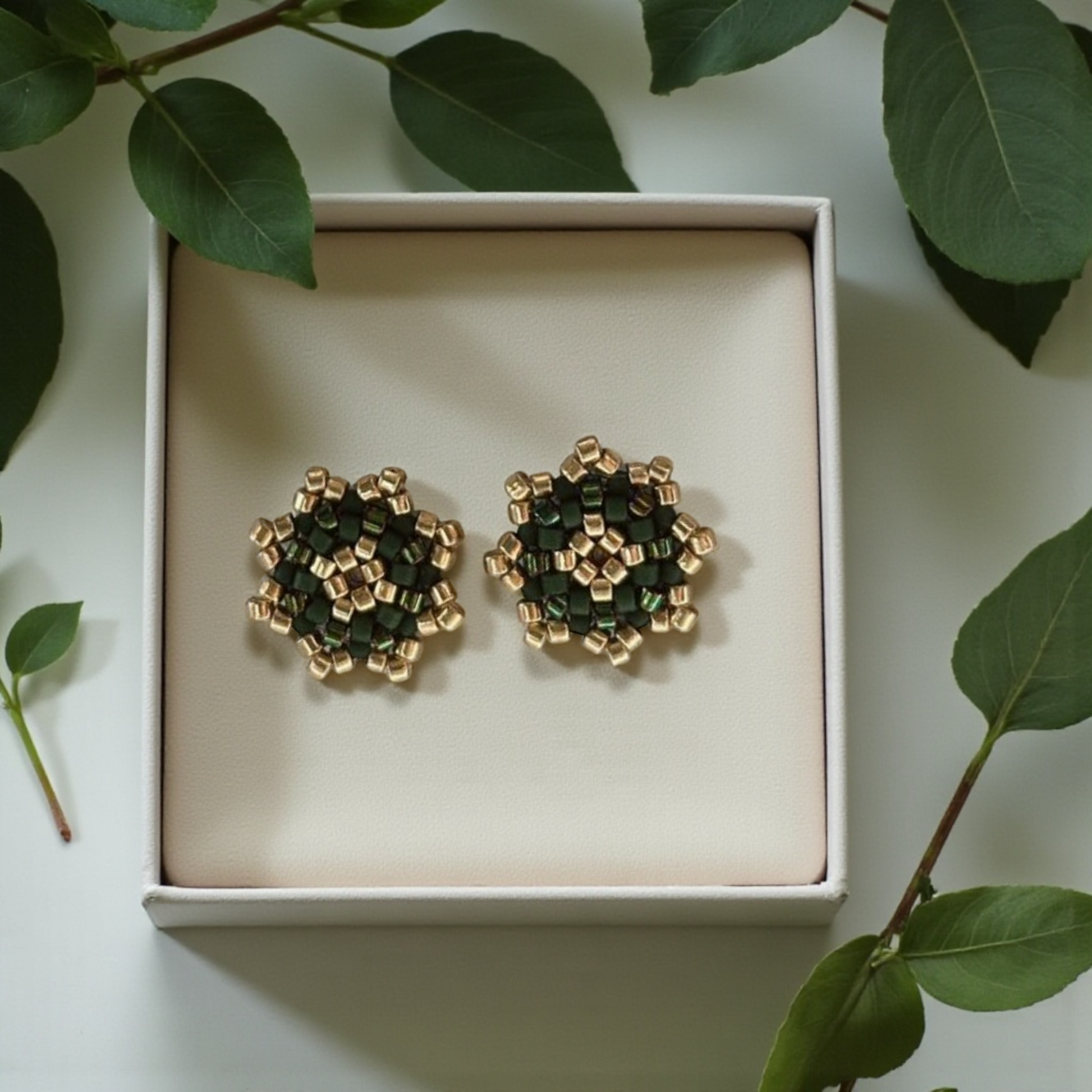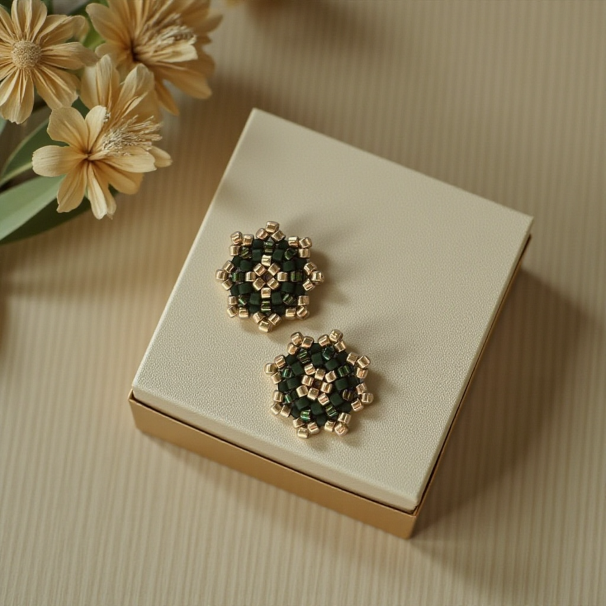 Ez a kézzel fűzött fülbevaló a természet mélyzöld nyugalmát és az arany fény meleg erejét egyesíti.